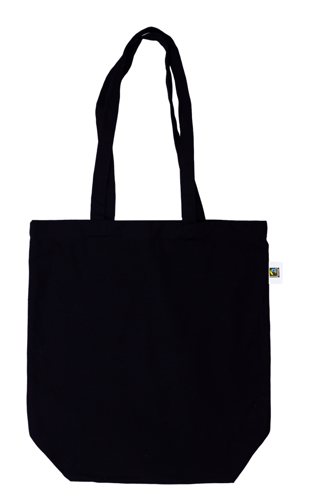 This shopping bag is made from durable Fairtrade cotton. It supports ethical production standards. The bag features a reinforced bottom. This provides extra stability for contents. It is a reusable and robust bag. You can choose between Black and Natural colors.