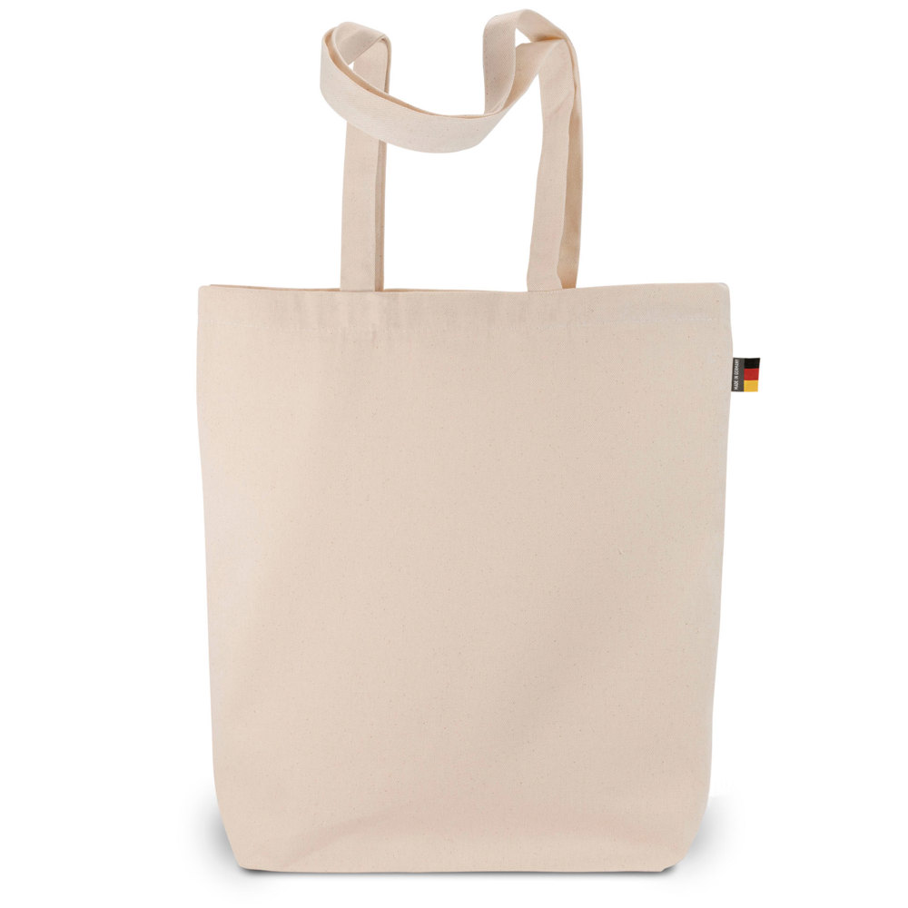 The LEIPZIG cotton bag is a versatile shopper. It features long handles for comfortable carrying. A bottom fold provides extra capacity. This bag is crafted from 100% OEKO-TEX® MADE IN GREEN certified cotton. It is entirely produced in Germany.