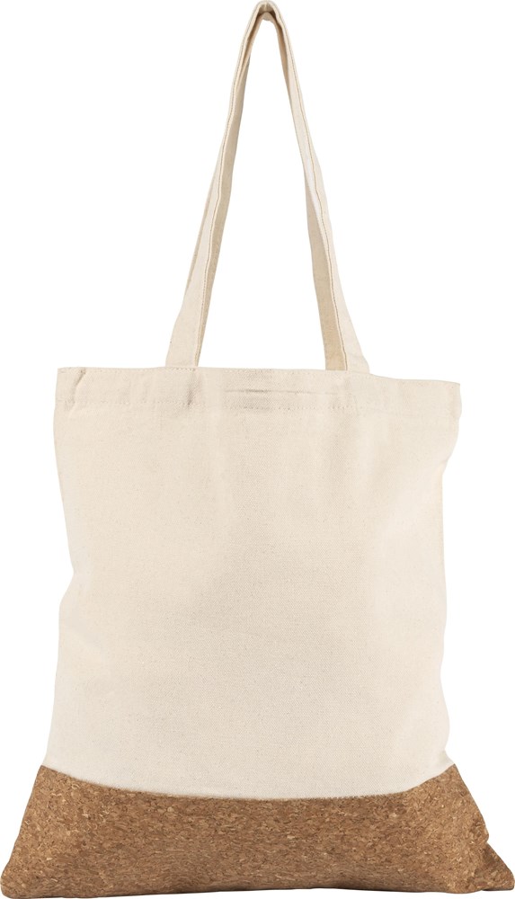 This tote bag is crafted from 250 g/m² cotton. It offers a substantial feel and increased durability. The bag features distinct cork fabric accents. Its handles measure 58 cm in length. This length provides comfortable carrying on the shoulder or by hand. The Khaki-ecru color offers a natural and appealing look.