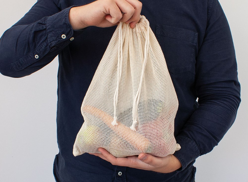 Organisch katoenen groentezakje Freddy bedrukken, herbruikbaar met net